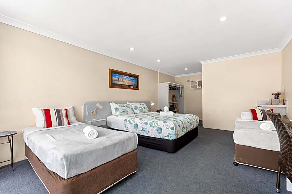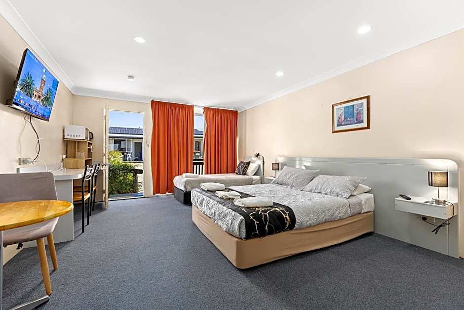 This room features a flat-screen TV with satellite channels and a kitchenette with a microwave. It offers views over Warwick city center.